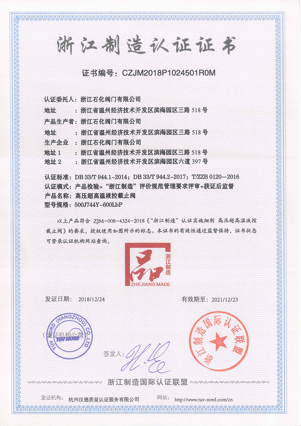 我公司于2018年12月通過了《高壓超高溫液控截止閥》的浙江制造認證證書,為了深入推進“三強一制造”建設,打響“品字標浙江制造”品牌,浙江制造推行了“品字標”企業(yè)“四個百分百”計劃,努力實現“品字標”企業(yè)廠區(qū)車間100%亮標、質量承諾100%公示、品牌產品100%貼標、廣告宣傳100%植入,以此不斷提升“品字標”品牌的社會知名度、認可度和美譽度。